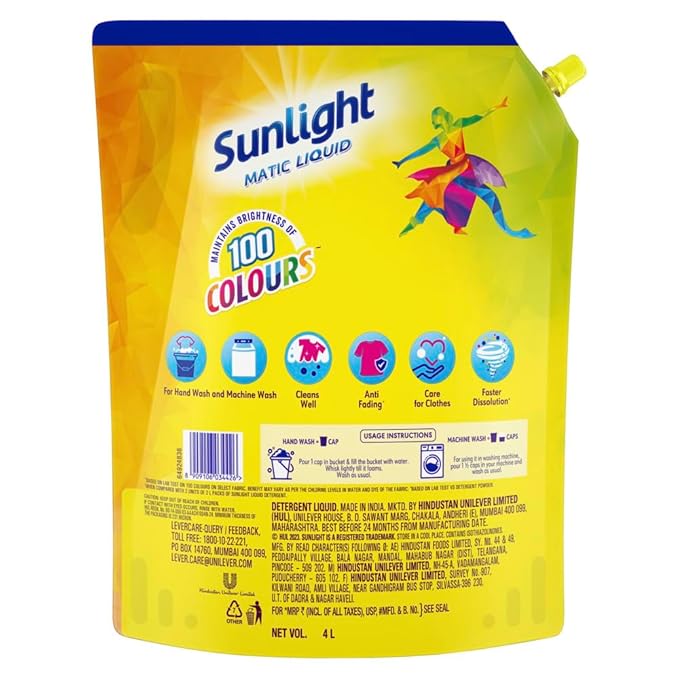 Use Sunlight Matic Liquid in every laundry wash for superior cleaning and to maintain the brightness of your clothes.